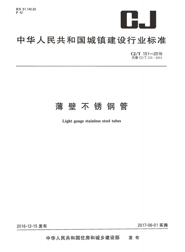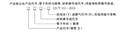產品標記由產品代號、管子外徑與壁厚、材料牌號或代號、用途和標準編號組成。標記格式:鋼管 ID 管子外徑 × 壁厚 材料牌號或代號(用途) CJ/T 151-2016